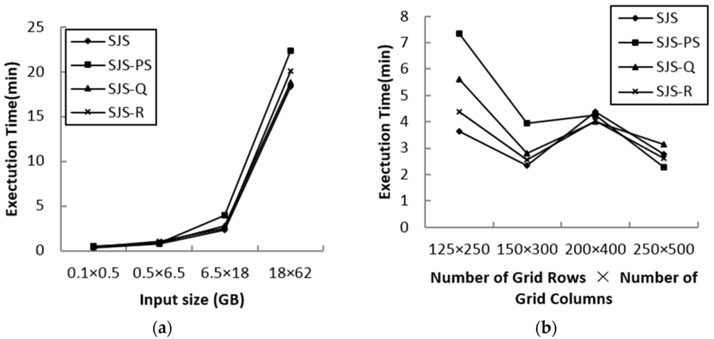 We vary the input dataset size from 0.1 GB × 0.5 GB to 18 GB × 62 GB. From Figure 8, it is observed that SJS’s performance is significantly better than that of the other algorithms. The results prove that SJS can manage massive spatial datasets and also deliver the best performance among the parallel spatial join algorithms.