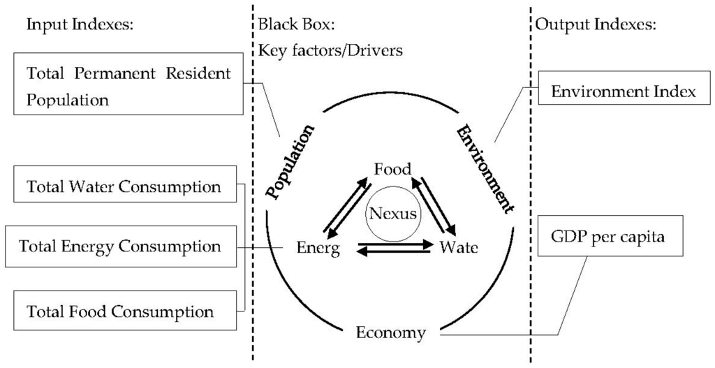 In the basic Cobb Douglas production function Y = Af(K,L), K and L are important input factors among which K represents capital and L is the labor force. f means the institutions, while A means the innovations or other factors which can also affect the output Y. Therefore, on the input side of this production function, we treat the consumption of WEF resources as K, and the permanent resident population as L, while on the output side, both the economy and environment are taken into consideration [33,34,35,36]. Furthermore, we determine the DEA efficiency to evaluate the input-output efficiency of WEF resources. Since innovation and management can both enhance efficiency [37], in the WEF-Nexus system we consider only the management approach to enhance efficiency, so Part A in the function has been taken into consideration. On the other hand, the key point of input-output efficiency is the human factor, which definitely needs to be enhanced, while the facilities are secondary. Therefore, the effective way is to focus on the human factor through resource governance in order to enhance input-output efficiency.