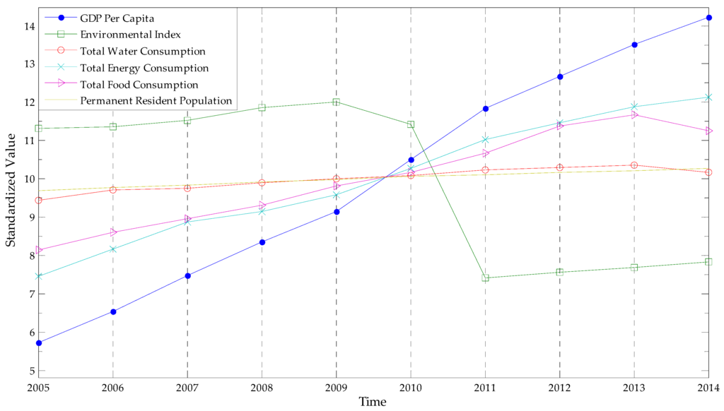 The validity of the input and output index systems is that the index system is satisfied with the DEA premise that there is no strong linear dependence among indexes. The trend graph, shown below, is a useful tool to compare the changing trends among indexes. With its differential units, standardization, and dimensionless form should be applied among the indexes. The Standardized Values (SV) of indexes are computed with Equation (11), in which is the value of index j (j = 1, 2, …, 6) in the ith year (i = 1, 2, …, 10), that is, . Figure 3 shows the validity of the index system in our Chinese case. Although they are all increasing in the input indexes, or fluctuating in the same pace in the output indexes, speed shows the greatest difference, which means that they are independent. With China’s one child policy, permanent resident population stays stable, which is similar to total water consumption because of its water scarcity. However, total energy consumption fluctuates in the same pace with GDP per capita, while environmental index is always rising with the nature of cumulative, and fluctuates in contrast to the total energy consumption and GDP per capita. The total food consumption rises stably in the period of 2005–2014. In addition, the strong interconnection in the consumption of WEF resources has been verified.