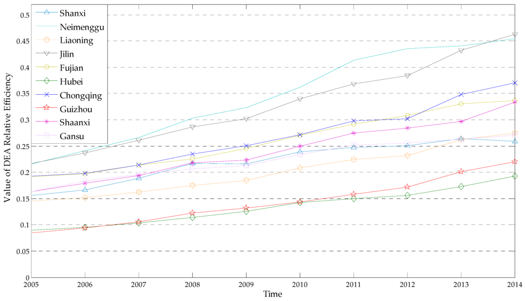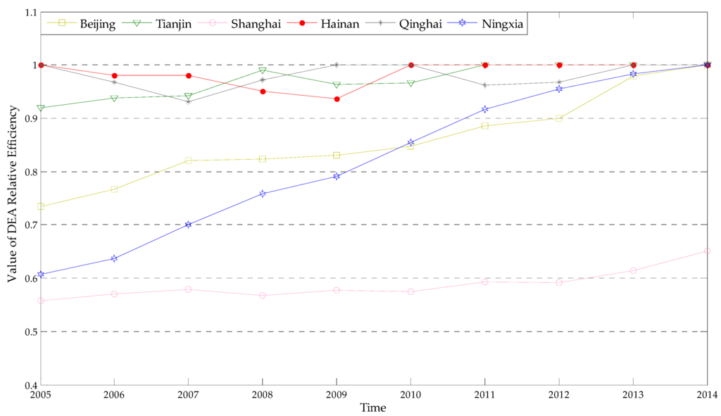 In the vertical dimension, one PPS is constructed, which contains 300 DMUs from 30 regions during 10 years. Table 3 shows the results of the trends from 2005–2014. Table 3 also shows that the input-output efficiency of all the regions, during this period, is increasing. This occurs because in each region the value variation has been magnified between 2005 and 2014 because it is larger than the variation in Table 2, but with different speeds that mainly result from the variations in development levels, policies, and in the natural environment. Based on its rising characteristics, 30 regions can be divided into three types: stable with high efficiency area, rapidly increasing with low efficiency area, and slowly increasing with low efficiency area.