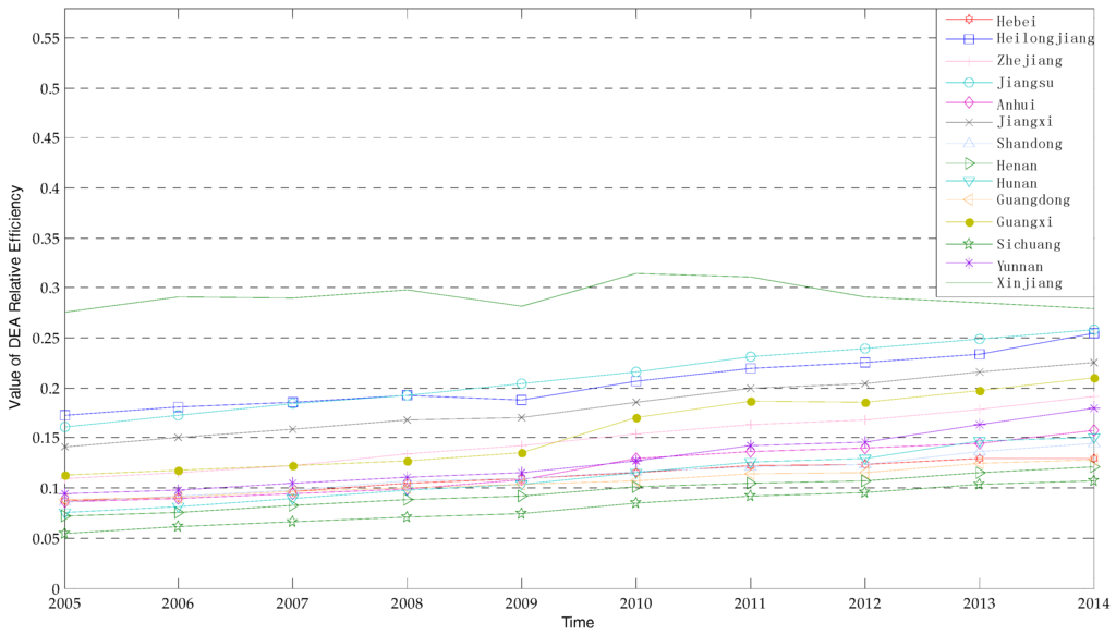 Slowly increasing with low efficiency area (Figure 6). There are 14 provinces in this area, mainly located in coastal and border regions, and their rising in input-output efficiency is slow or fluctuating like Xinjiang. Coastal developed provinces, such as like Guangdong, Jiangsu, and Zhejiang, and Coordinated Development Areas, like Hebei, should adjust and upgrade their industrial structures to enhance efficiency. However, border regions like Guangxi, Yunnan, and Heilongjiang, should obtain accurate policy support from the central government to facilitate their development, protect the environment, and simultaneously achieve DEA efficiency.