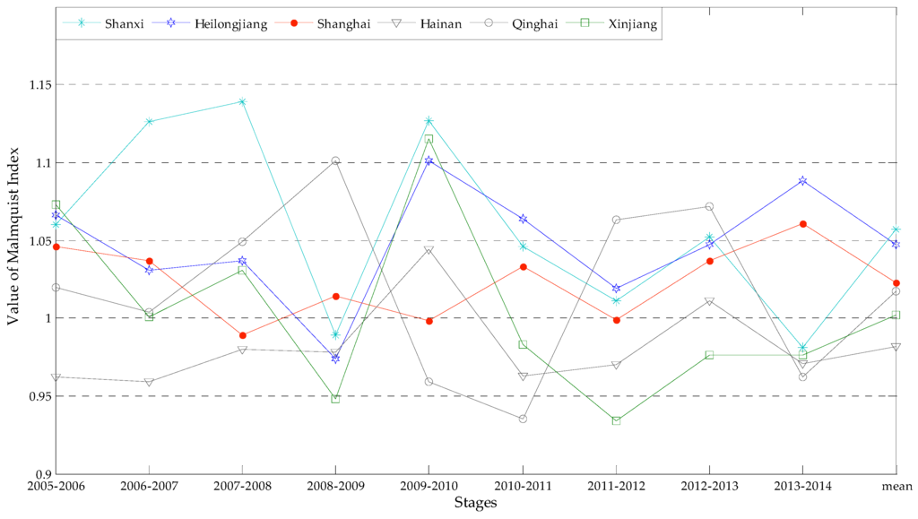 With the division of the Malmquist index value (M value) into the TC and EC values, we further explore reasons for the fluctuation of efficiency in varied regions. Results show that the M value of most regions is greater than one, which means that their input-output efficiencies are all rising, conforming to our earlier results using the DEA Model; but there are still some regions, including Shanxi, Heilongjiang, Shanghai, Hainan, Qinghai, and Xinjiang, with an M value less than one in some years, which means that their efficiency is decreasing during the 9 stages in the period of 2005–2014 (Figure 7). Among these six provinces, only Shanxi and Heilongjiang are mainly in the 2008–2009 stage, which is impacted by external events. Because the 2008 financial crisis has shocked their industrial structures, which are dominated by the coal industry, the decline on coal sales leads to decreasing of GDP, and finally affects the input-output efficiency. So the fluctuation of latter ones except Shanxi and Heilongjiang should be divided.