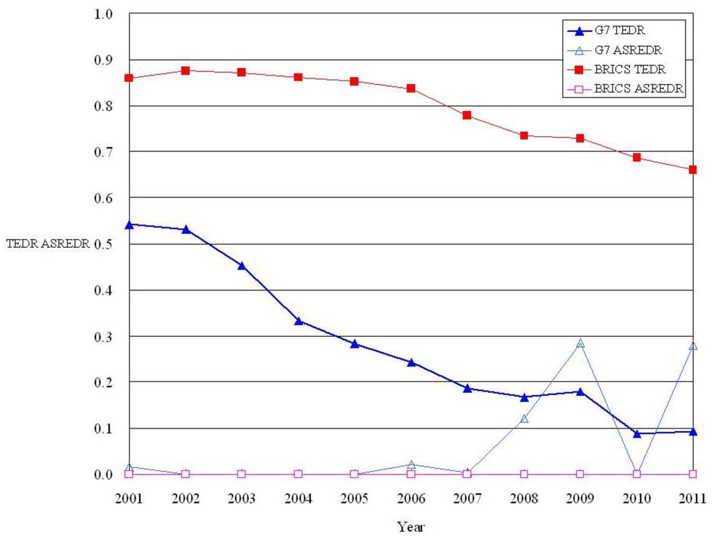 South Africa always has a low energy efficiency score, except for 2000, when its energy efficiency score was 1. Its lowest energy efficiency score is 0.145, which appeared in 2009. The result seems to match South Africa’s GDP growth rate since it had a negative GDP growth rate (−1.5%) for the financial crisis year of 2009, while it had a decent GDP growth rate (4.2%) in 2000. The United Kingdom and Brazil have the best energy efficiency in the G7 and BRICS, respectively. Song et al. [33] also conclude that Brazil has the best energy efficiency in BRICS. De Castro Camioto et al. [43] point out that the reason for Brazil’s good energy efficiency ranking is that Brazil’s government implemented national energy programs for many decades, and they are still in operation, such as the National Program for Energy Conservation since 1985, the National Program for the Rational Use of Oil Products and Natural Gas since 1991, and mandatory energy efficiency programs. In addition, the energy efficiency scores in these two groups show a large difference, because energy use in the primary data has the largest variance of all variables.