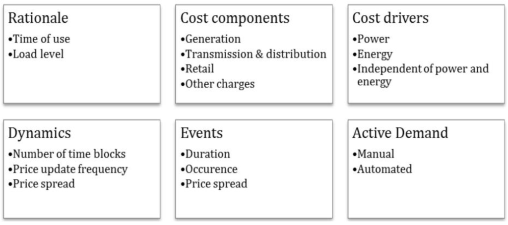 Attributes of electricity pricing schemes (adapted from Dütschke and Paetz, 2013 [7]; and Dupont et al., 2014 [9]).