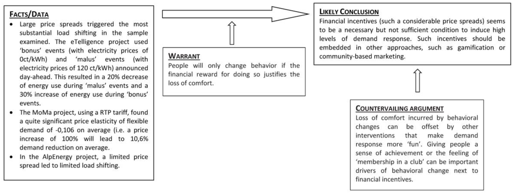 In the process of drawing conclusions we were faced with a number of difficulties. First, as mentioned in Section 2.2, a full understanding of household reactions to DR interventions requires an in-depth contextual understanding, especially of the energy-related practices (washing, drying, heating, air conditioning, bathing, cooking) these households are engaged in. Since we had to rely on the research done and reported by the smart grid pilots themselves, this detailed information was not available to us. Secondly, as many projects applied multiple incentives combined with several other interventions, such as project communication, the appropriate type of end-user feedback, and so forth, it was difficult to single out the effect of introducing dynamic tariffs. Third, due to the diversity of projects that were investigated—in terms of project design, scope, scale, timeframes, objectives and target groups—it is also difficult to compare them on equal footing in the cross-case analysis.