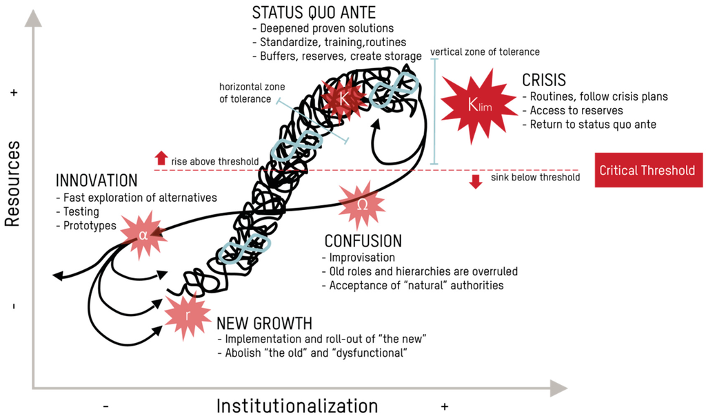 Adaptive cycle applied to social systems. Stages in this cycle are similar to ecological stages, from new growth to status quo, to confusion, and innovation. The differentiation between crises that remain within the threshold and those that lead to dissolution are indicated by the vertical range of tolerance.