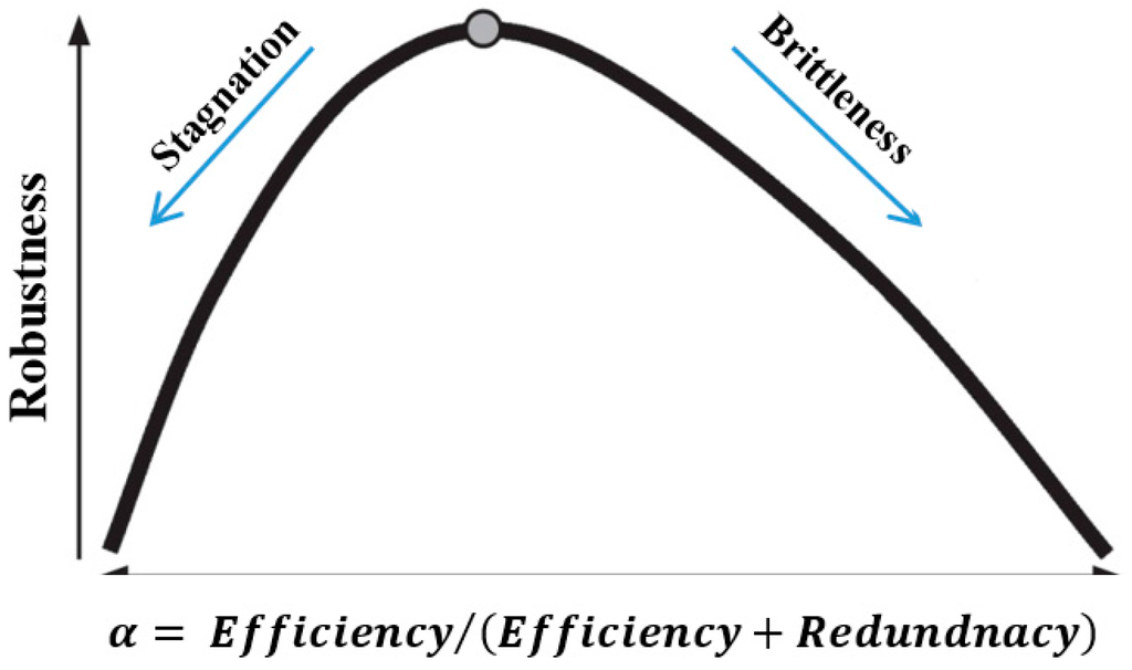Intuitively, following a disruption, networks with more diverse connections are more flexible in rerouting their flows and maintaining critical functions. Conversely, a more efficient network with a minimal number of well-organized connections can concentrate its capacity for growth and development. As illustrated in Figure 2, overly redundant networks may be incoherent and lacking the efficiency to grow, while overly efficient networks may be brittle and prone to collapse when subjected to stress. To help determine a balance between the constraint imposed by efficiency and the flexibility provided by redundancy, the relative order in the system is introduced as: