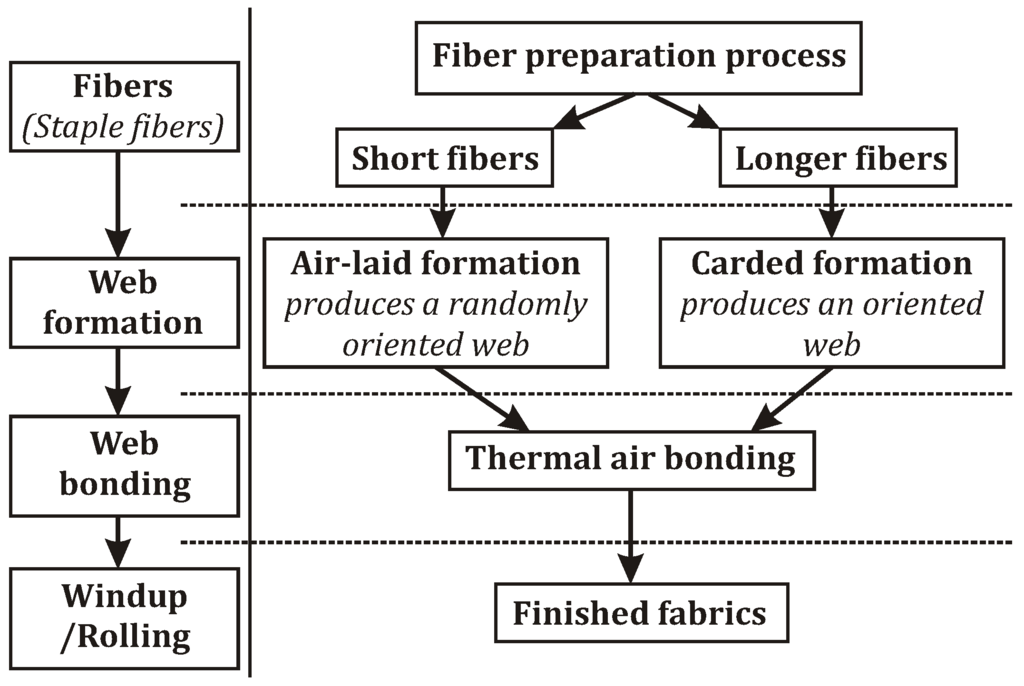 Finally, a web consisting of two or more layers needs to be bonded by either mechanical or chemical or thermal methods. Among which, the thermal air bonding is preferably deployed because it is environmentally-friendly without any latex binder, and it also consumes less energy compared to foam bonding or hydro entanglement bonding. In this type of bonding, it is in charge of controlled and heated air inside a chamber with varying temperature zones to allow the thermoplastic fibers to be melted and softened before they are cooled down to become a bonded sheet with a smooth surface and high strength that can be applied in various applications. Typically, the temperature is responsible for the texture and the strength if the final fabric, i.e., a low temperature produces an uneven bonded soft sheet or a weak tensile, while a high temperature leads to a hard texture and a plastic-like sheet. In the case of more complicated fabrics, patterns/textures and colors can be created and embedded on two sides of the sheet by using hot patterned rollers with suitable pressure and temperature.