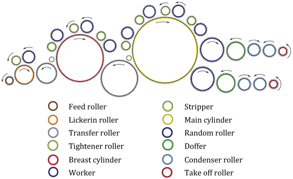 In the fiber preparation and web formation, the fibers are straightened and separated into individual fibers with minimum or low fiber breakage and distributed in a parallel manner before being transformed into the form of a web. The principal mechanism in these processes are shown in Figure 2, where the rollers are positioned, colored, and named accordingly.