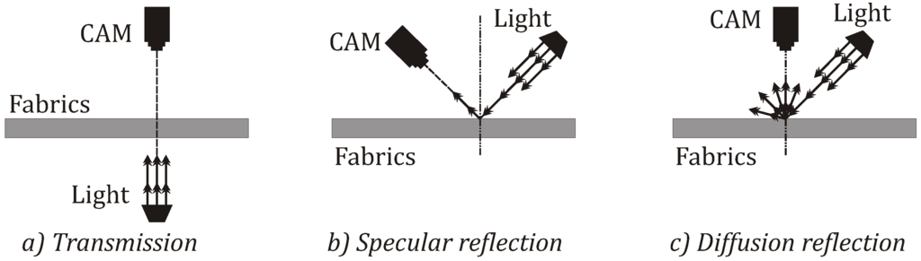 There are three common approaches for the system setup including light transmission, specular reflection and diffusion reflection as shown in Figure 3. The first approach works based on the fact that the presence of foreign materials or impurities leads to the change in the intensity of the light while the second one works based on the fact that uneven surfaces or impurities can affect the amount of light reflected to the camera due to the light diffusion. Moreover, in the diffusion approach, the change in the level of the light reflected from the sheet can of great help to identify defects by the diffusion properties of light; thus, it is usually employed in the non-woven fabrics industry.
