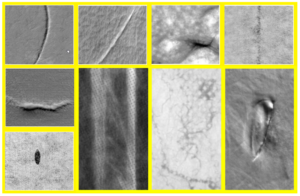 Through the inspection system, the team has identified the following major 18 failure modes: Holes; Eyebrows; Polymer Drips; Broken Filaments; Dirt; Wrinkles; Bond Points; Fusions; Light Spots; Dark Spots; Thin Spots; Thick Spots; Calendar Cuts; Meltblown Filament Drops; Scratches; Streaks; Clumps; and Contamination. Some of their typical images are shown in Figure 4.
