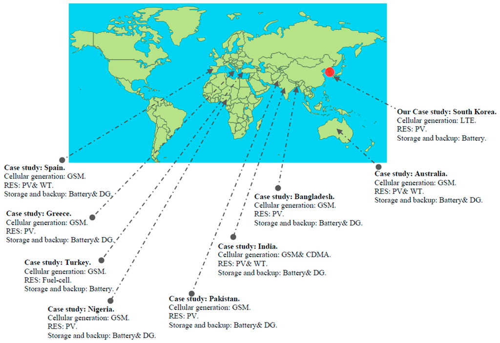 Solar energy was used extensively in the telecommunications industry in the 1970s for microwave repeaters to connect remote towns and homesteads to the telecommunication grid, allowing them to access the same radio, telephone and television services that their urban neighbours had long enjoyed. In addition, photovoltaic energy powered telecommunication satellite earth stations, rural telephony, and telephone exchanges [8]. However, this section discusses the renewable energy solutions in cellular communication technology; several studies have been conducted to help mobile network operators to achieve their ambition to maintain profitability while protecting the environment by shifting away the use of diesel generators to feed off-grid base stations. Figure 1 highlights the different studies that have been conducted to develop environmentally friendly cellular networks with low operational expenditures in different regions around the world.