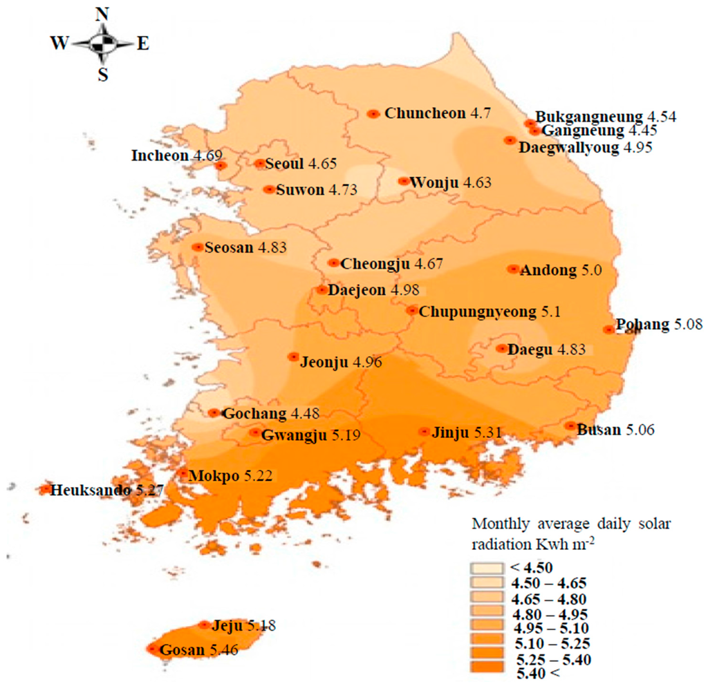 Moreover, solar radiation in different areas of South Korea is shown in Figure 4. Relatively higher daily solar radiation of over 5 kWh·m−2 can be obtained in the southwestern coastal area, including Jeju Island. In contrast, in the northwestern region around Seoul, daily solar radiation is lowered to approximately 4.7 kWh·m−2, and Gochang, located at the western coast of South Korea, shows the lowest daily solar radiation of 4.48 kWh·m−2.
