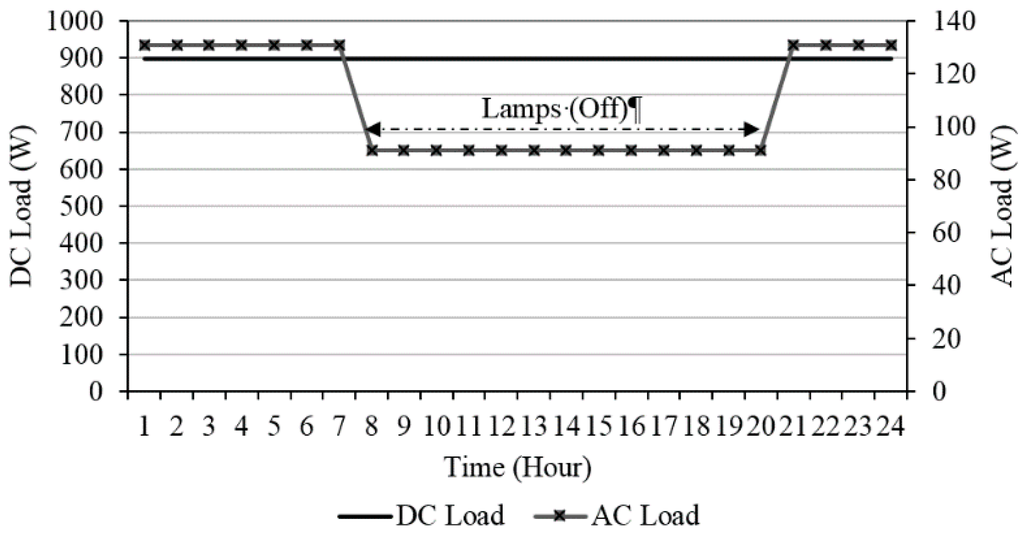 In addition, Figure 6 shows the hourly load profiles. The AC load includes a 91 W air conditioner that represents 10% of Pin and 40 W lighting that operates from 7 p.m. to 7 a.m. The DC load includes a base station (Pop minus air conditioner equals 819 W and microwave backhaul equals 80 W).