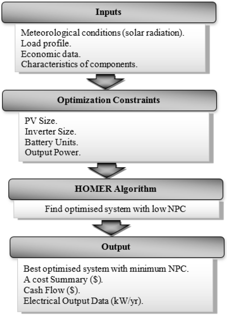 HOMER [23] is the optimisation software used in this study to determine the optimal solar power system that satisfies user-specified constraints with the lowest net present cost NPC, which represents all the costs that occur within the project lifecycle, including the initial costs (IC), replacement costs, and O&M costs. Figure 8 summarises the main parts of the HOMER simulation, inputs, optimisation, and outputs. The NPC is computed as follows,