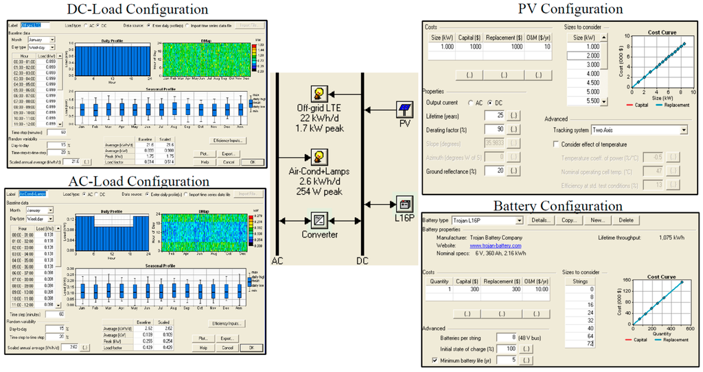 The implementation of a stand-alone solar power system within the HOMER simulation software and the configurations for the various elements in the system are shown in Figure 10.