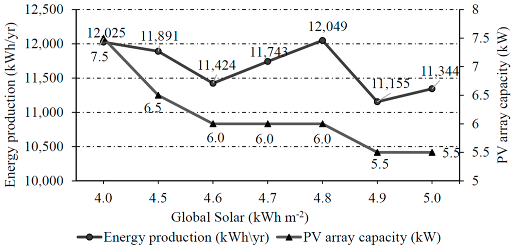 Figure 11 shows the annual output energy of the solar power system for different cases of solar radiation. The annual output energy of the solar power system increases with increasing solar radiation at a given PV size.