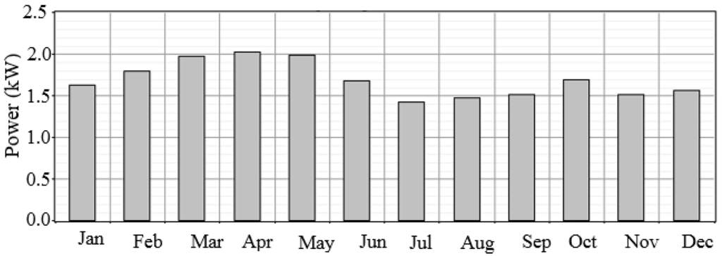 The average daily solar radiation in South Korea, which is located at a latitude between 34° and 38°N, is estimated to be 4.01 kWh·m−2 and varies from 2.474 kWh·m−2 in December to 5.622 kWh·m−2 in May [4,5]. Monthly variation, as shown in Figure 3, is largely because of the shift in the elevation angle of the sun. Additionally, the long spell of rainy weather in early summer decreases the global horizontal irradiance in June and July.