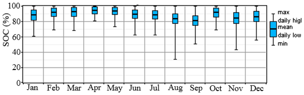 The maximum state of charge (SOCmax) of the battery bank is equal the nominal capacity of the battery bank, while the minimum state of charge (SOCmin) is 30%, which means the maximum energy that will be delivered from the “Trojan L16P” battery bank is 70%. This value is called the depth of discharge (DOD) and is expressed as follows [23],