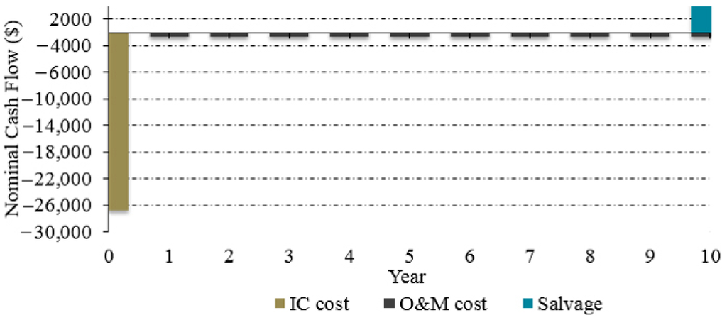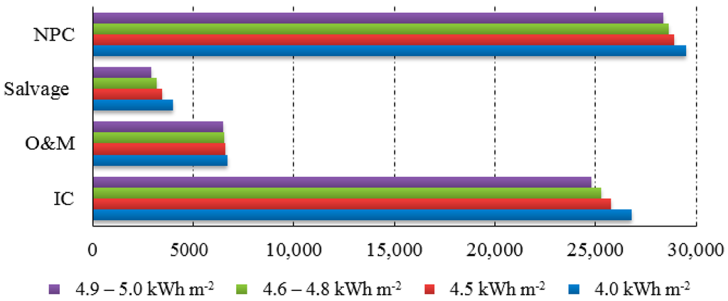 IC is the construction cost of the proposed solar power system, which is paid at the beginning of the project and depends on the components included in the solar power system. The O&M costs are the annually costs to operate and maintain the system components. Table 3 shows that both the IC and O&M costs decrease with increasing solar radiation because the size of the solar array decreases. The decrease in both IC and O&M results in an overall decrease in the total cost of the solar power system (NPC). More details are provided in Section 8.4, “Economic Analysis.”