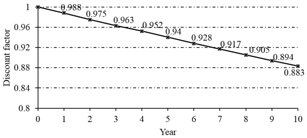 The discount factor (fd) is a ratio used to calculate the present value of cash flow that occurs in any year of the project lifetime and is expressed as follows,