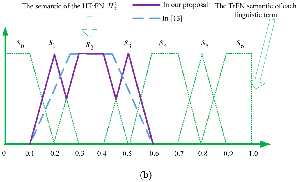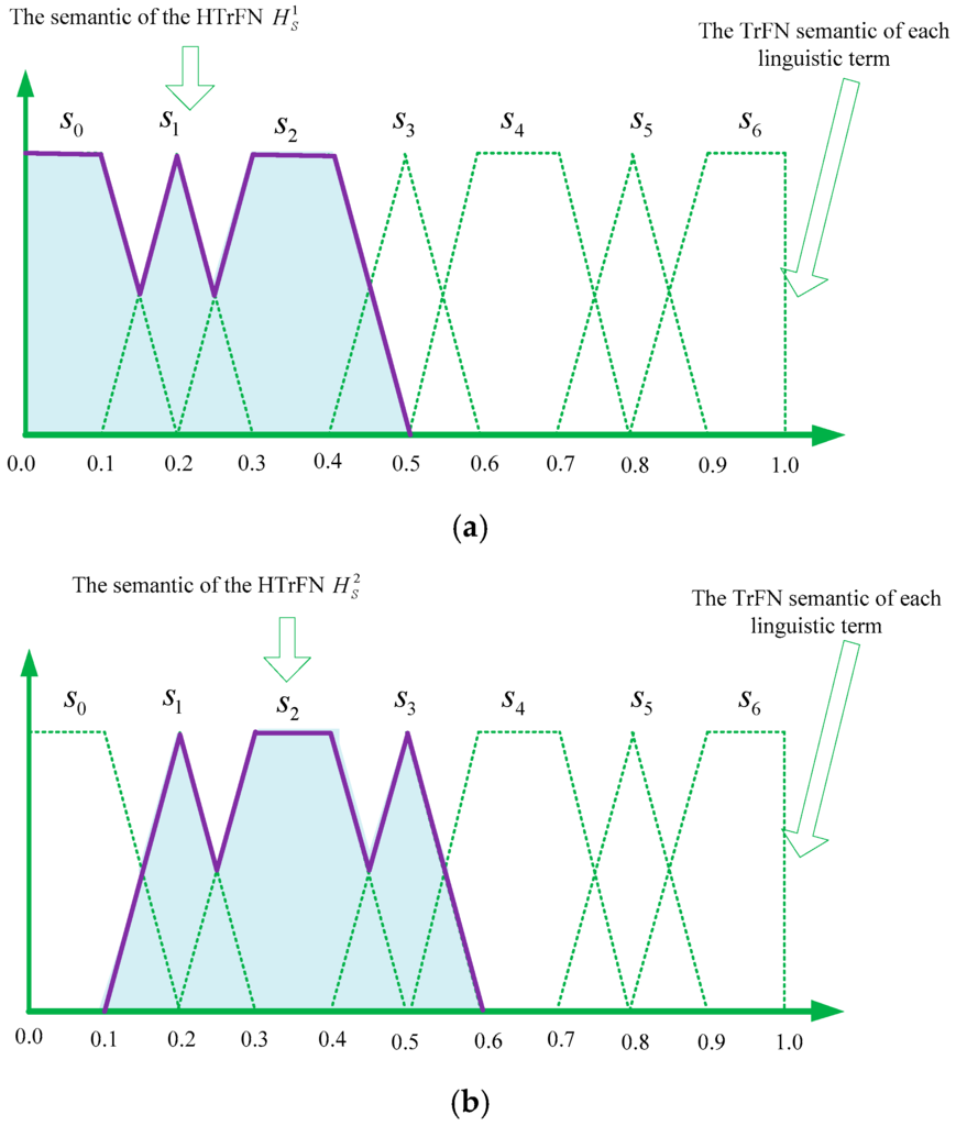 and the relations between the two HFLTSs and their corresponding HTrFNs are depicted in Figure 1.