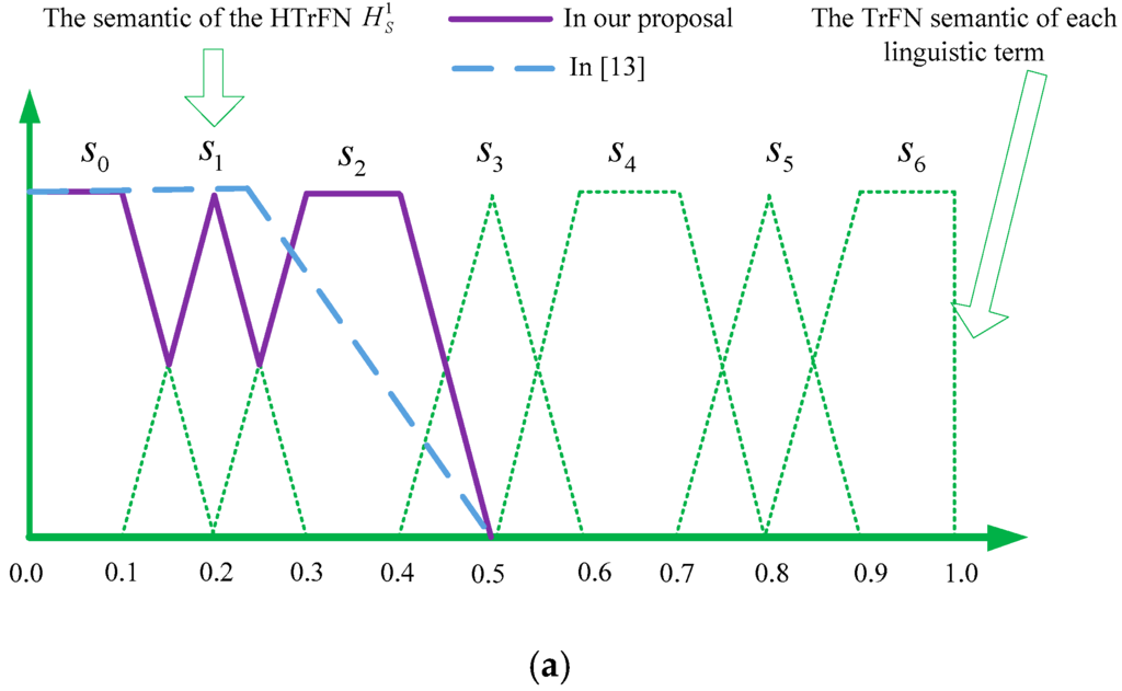 It can be easily seen from Figure 2 that the HTrFNs take the semantics of each linguistic term of the HFLTSs into account; while Liu and Rodriguez’s [13] proposal uses the TrFNs to represent the semantics of HFLTS, which is relatively complex because the TrFNs are obtained by aggregating the fuzzy membership functions of the linguistic terms of the HFLTS using the OWA (ordered weighted averaging) aggregation operator.