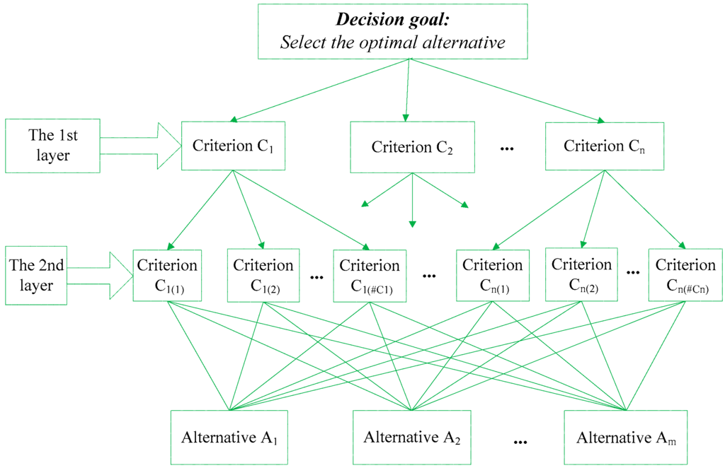The MCDM is usual to find the best compromise solution from a set of feasible alternatives characterized with multiple competing criteria. This study focuses on a hierarchical MCDM problem with a two-layer structure, which usually involves a given set of main criteria and the corresponding sets of sub-criteria. The framework of the hierarchical MCDM problem is shown in Figure 3.