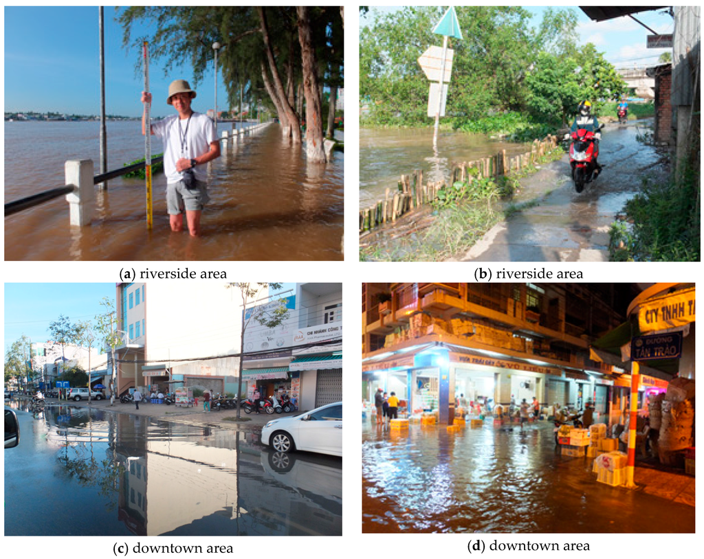 The present inundation level at Can Tho City, which is predominantly lower than 10 cm, seems to be manageable for a population familiar with regular seasonal floods. Local inhabitants try to mitigate inundation damages on their properties by temporal countermeasures such as the flood protection wall shown in Figure 2e. These attempts seem to be effective in limiting the risk for now.