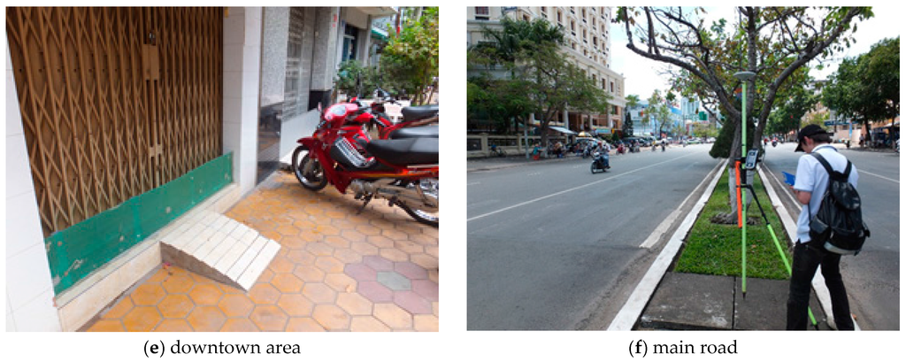 Relative ground levels (meter), which are shown in yellow, were measured from the height at the base point on the riverbank of Can Tho, Vietnam, using the Static GPS. Locations: (a) the main road crossing the city center, discussed in the main text (see Figure 2f); (b) a road raised by about a half meter; (c) a market street closed to the river; (d) a reclaimed area around a low-lying swamp; and (e) the road in front of Can Tho University.