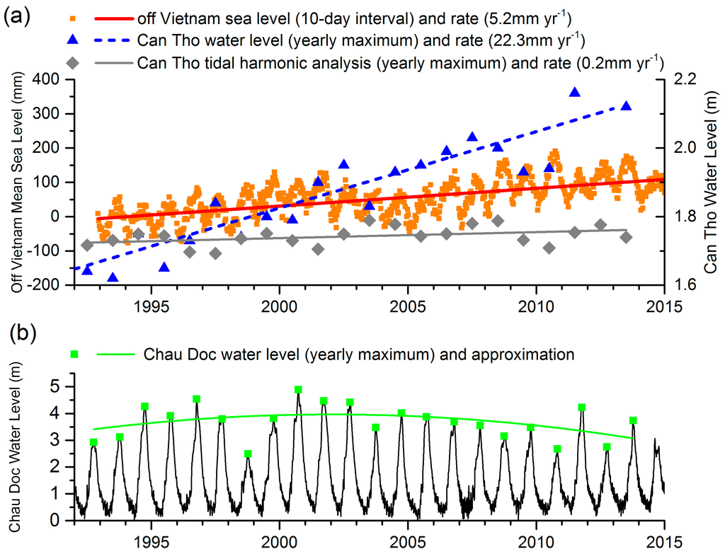 Water levels off the coast of Vietnam (orange on (a)), at Can Tho (blue on (a)), and at Chau Doc (b). Measurements of sea levels off the coast of Vietnam taken from the TOPEX and Jason series of satellite radar altimeters (reproduced using the Regional Sea Level Data of the University of Colorado). Yearly maximum water levels at Can Tho Monitoring Station (80 km inland) and Chau Doc Monitoring Station (190 km inland) were derived from the MRC data. The grey line on (a) shows the result of harmonic analysis of 60 tidal constituents at Can Tho, showing the yearly maximum water levels and rate of change.