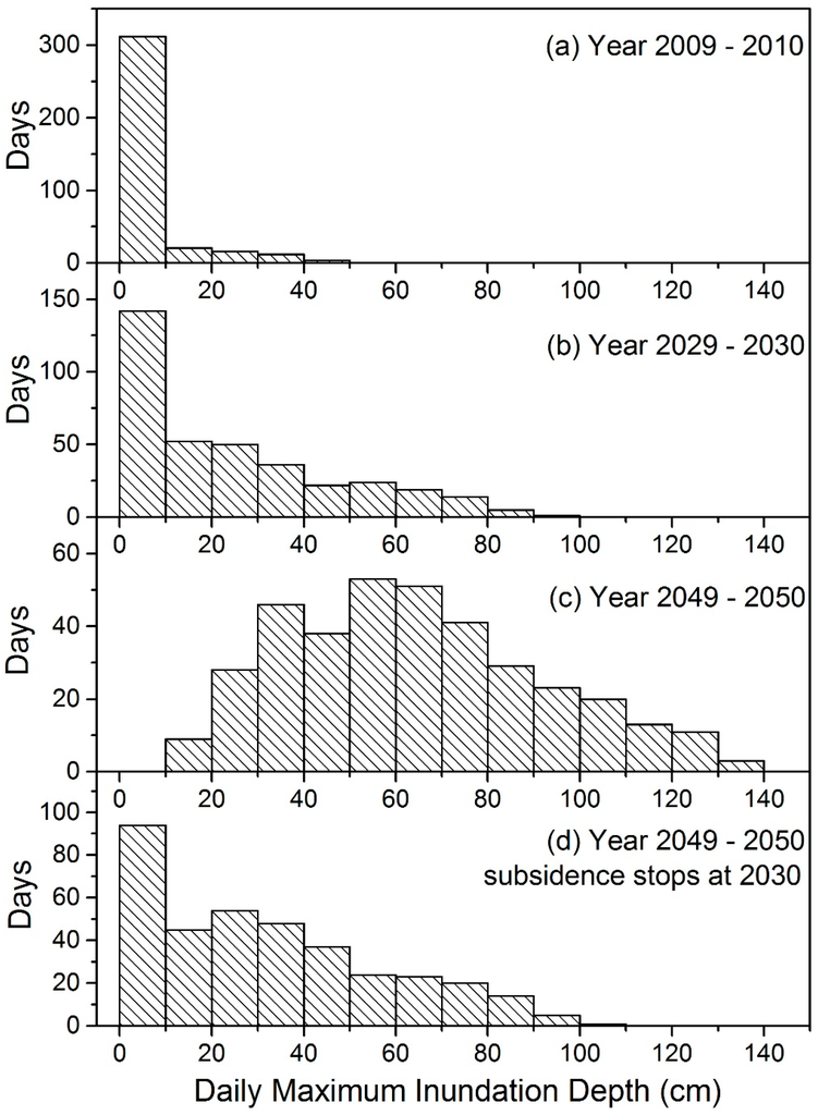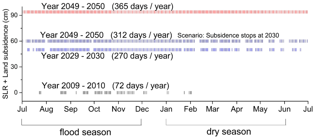 This paper has only considered the effects of increased flooding from ongoing sea level rise combined with land subsidence, largely caused by excess groundwater withdrawal. With increasing CO2 emissions, significant additional SLR is inevitable and thus it is not expected to be possible to eliminate its effects in the short term. On the other hand, land subsidence can be halted by implementing reasonable countermeasures, as proven by a handful of successful cases in the other cities such as Tokyo []. Figure 5 shows that ending land subsidence by 2030 will contribute to decreasing the duration of inundation by about 50 days compared to the 2050 scenario with continued subsidence. The reason of that 2030 was selected as an end date for land subsidence in this scenario is that land subsidence appears not to stop immediately, but continues for a long period even after mitigation plans are taken. For example, Tokyo took about 15 years to stop land subsidence after legal regulations such as the Industrial Water Act were put in place [].
