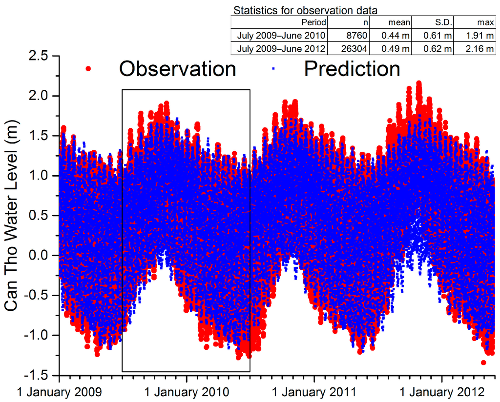 The present study assumed that the pattern of water levels observed in the period between July 2009 and June 2010 will repeat in the future. This means that future water levels were given as a prerequisite and treated deterministically in this study, neglecting interannual or interdecadal variations. However, this simplification will inevitably bring about some amount of error in flood projection. For instance, Figure 7 shows that water levels are clearly changing in response to seasonal tidal patterns in addition to predominant semi-diurnal or diurnal tidal fluctuations. In two of the plots shown in the figure, predicted water levels derived by the tidal harmonic analysis do not show substantial differences from year to year with respect to both annual highest and lowest water levels. On the other hand, annual highest water level in the recorded water levels appears to be changing year by year (e.g., about 30 cm between October 2009 and October 2011). This was likely caused by a difference in year-by-year variation of discharge from the upstream river. The hydrological statistics compiled by MONRE (2011) [] also shows that for the 2000 and 2010 data series, the yearly maximum water levels at Can Tho varied from a minimum of 1.79 m in 2000 to a maximum of 2.03 m in 2007, demonstrating that maximum water levels are fundamentally fluctuating over many years. In this sense, the maximum level of 1.93 m recorded in the period between July 2009 and June 2010 can be considered to represent a typical value of maximum high water levels in recent years. Figure 7 also appends the statistics of observed data for two intervals, July 2009–June 2010 and July 2009–June 2012, in order to show that the standard deviation of water levels does not significantly change according to the period. Although the maximum and mean water level could be both increasing as time passes due to the combined influences of SLR and land subsidence, the short-period water-level fluctuation that could be represented by the standard deviation is relatively stable. This observation further supports that the one-year-period data between July 2009 and June 2010 could be recognized as water levels measured in a typical one-year in terms of water level characteristics.