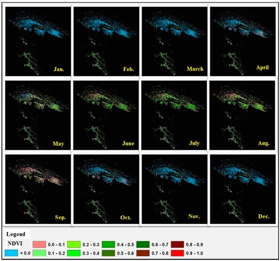 Gap-filling of NDVI time-series data produced a cleaned (smoothed), continuous curve of the NDVI for each pixel, while keeping much of the temporal information of the original dataset intact. Spatial and temporal variations of the mean annual grassland growth cycle of the study area over the 12 years from 2001 and 2012 is depicted through representative observations for each month. The spatio-temporal distribution of mean monthly variation of NDVI over 12 years of grasslands along altitudinal and/or latitudinal gradients is presented in Figure 2. The NDVI climatological analysis produced from monthly sequences of NDVI images indicate the spatiotemporal dynamics of grassland distribution at the landscape scale. In winter, most grasslands at higher altitudes (>2500 m) had negative NDVI values due to persistent snow cover; however, these permafrost layers of snow are a critical component for moisture supply to grasses. Several patches at middle and lower elevations did maintain slightly positive NDVI values. Initial increases in NDVI values were usually sharp and probably reflect the combined effects of new vegetation growth and snow melt, which by itself causes an increase in NDVI signals [19,45]. By mid-summer, most of the grasslands displayed rising NDVI values, though a few scattered low elevation patches had already peaked by early summer. Most of the patches were at their peak greenness in mid-summer (approximately June/July), after which NDVI values in most patches slowly decreased in September/October. Sharp decreases in NDVI values were marked by the beginning of winter, the end of the growing season, and the start of the snowy season (October/November) at high elevations.