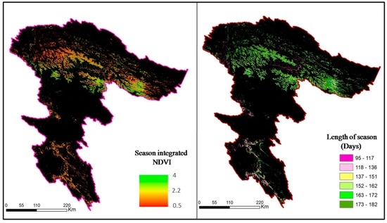 Patterns in grassland productivity (season cumulative NDVI) and length of season across the study area.