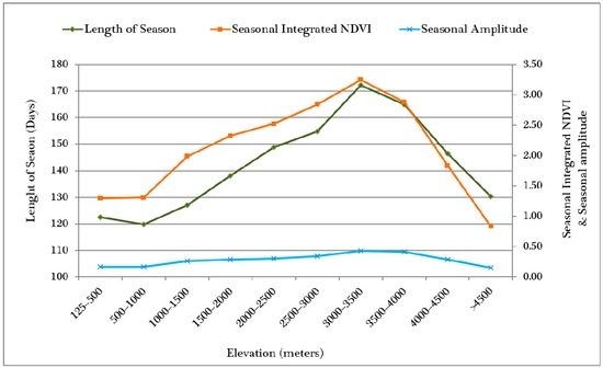 Vegetation productivity metrics strongly correlated with elevation. The productivity positively related with increased elevation, reach a maximum productivity at an altitude of 3500 m, after which the relation tended to be strongly negative, with productivity sharply dropping to a minimum productivity across the whole range at the highest elevations. The gradual increase in cumulative seasonal productivity along with increased elevation might be a function of the corresponding increase in the length of the growing season.