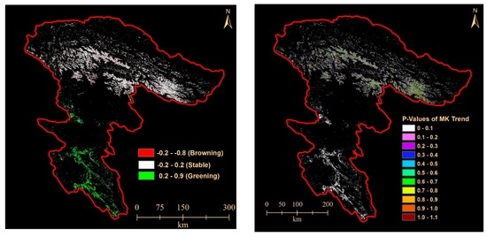 Spatial distribution of greening and browning trends along with respective significance (p-value).