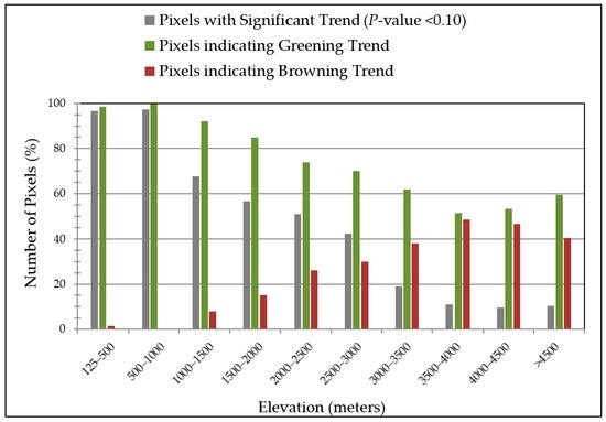At mid-elevations (zones 3, 4, 5, and 6), the percentage of pixels and the average strength of the monotonic trend of greening pixels dropped from 92% to 70% and 0.30 to 0.21, respectively, whereas the remaining browning pixels increased in terms of percentage (8% to 30%) and the strength of the trend (−0.20 to −0.25). The high-elevation grasslands (range 7, 8, 9, and 10) seemed be represented by almost equal numbers of greening (59% to 51%) and browning (41% to 49%.) pixels, but the strength and significance of the trends became weaker for both greening (0.17 to 0.15, p-values 0.05) and browning (−0.17 to −0.14, p-values 0.05) pixels.