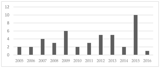 The dispersion of the publications show a vague trend. While it was expected that the sample covers a small amount of papers it can be ascertained that the most papers were published in 2015. One attempt to explain this increase since 2009 is to associate those numbers to the review papers of previous authors dealing with SSCM aspects. As the literature review of this paper reveals, there are a great number of reviews available which highlighted the neglected social dimension of research papers. Moreover, between 2013 and 2015, the textile/apparel industry faced many issues, such as the Rana Plaza accident, which could be comprehended as a trigger for researchers to deal with social issues. Indeed, as this paper is written at the beginning of 2016, only one paper emerged, and thus it remains to be seen whether further papers are following (Figure 2). Regarding the appearance in journals, the leading one is the “Journal of Business Ethics” with six papers. Four papers appeared in the “International Journal of Production Economics”. The rest of the papers are dispersed across other journals with a maximum appearance of two papers per journal.