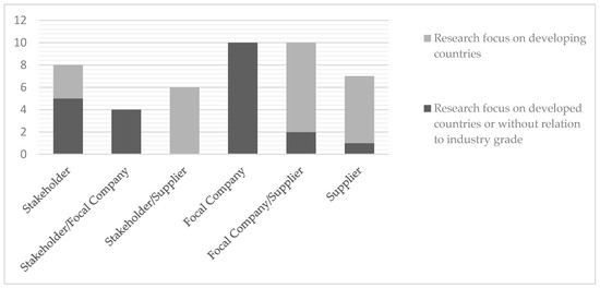 The following, Figure 3, differentiates the sample papers based on the SSCM actors that are mainly addressed. Moreover, it shows the country’s level of development which the paper primarily addresses, thus stating where the research sample of each study was located during the applied research method (e.g., survey on managers located in developed countries vs. survey on managers located in developing countries), and however, where the initial data for analysis has its origins, e.g., the study of Niklas Egels-Zandén and Lindholm [59]. They analyzed the factory audits conducted by the Fair Wear Foundation; however, the majority of suppliers are located in developing countries. Thus the authors consider this as “research focus on developing countries”. It is important to note, that in some studies, it is not identifiable where, e.g., survey managers are located, hence referred to as “without relation to industry grade”. Notwithstanding, according to RQ1, the main interesting data is whether the paper focuses on developing countries or not and hence is automatically categorized to “research focus on developed countries or without relation to industry grade”, once it fails. Suppliers as SSCM actors have been researched often by scholars (23). Unsurprisingly here, the proportion of developing countries being addressed is strikingly noticeable. Focal companies are another attractive research object across all the papers (24). Also, it is no surprise that here the proportion of developed countries being addressed are mostly evident. This can be referred to the fact that multi-national corporations of the textile/apparel industry are primarily located in western countries and thus the researchers have much easier access to data. Studying focal companies alone (10) and papers evaluating focal companies and suppliers (10) in one paper seems to be an attractive choice.