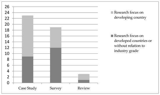 Lastly, Figure 4 emphasizes the research method used by the authors of each article. It is important to note that the majority of the case studies generally include interviews or questionnaires but need to be distinguished from an explicit survey method. A case study usually entails the detailed and intensive analysis of a single case (organization, location, person, and event) and lacks of generalizability. Differently, survey research consists of collecting data predominantly by questionnaire or by interviews on more than one case [64]. While reviews in the field are scant (3), conducting case studies (23), and surveys (19) are prominent. Case studies paid more attention to developing countries (14). Vice versa, surveys are increasingly conducted by researchers in developed countries (12).