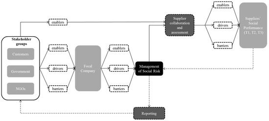 A huge number of the 31 papers refer to the supplier dimension, regardless of the papers’ actor focus. Predominantly, they are statements about the social performance of a supplier, with 22 papers. The second most-addressed categories are the barriers (20), followed by a number of enablers (17), and a slightly smaller number of papers which dealt with the drivers category (14). While social performance derived deductively from the literature review, the driving, enabling, and hindering categories derived inductively during the content analysis. Thus, a supplier, whether it is a Tier 1, Tier 2, or lower Tier supplier, also faces motivating, initiating, assisting, and hindering factors in the implementation of social risk management practices, which is usually being required by the focal companies.