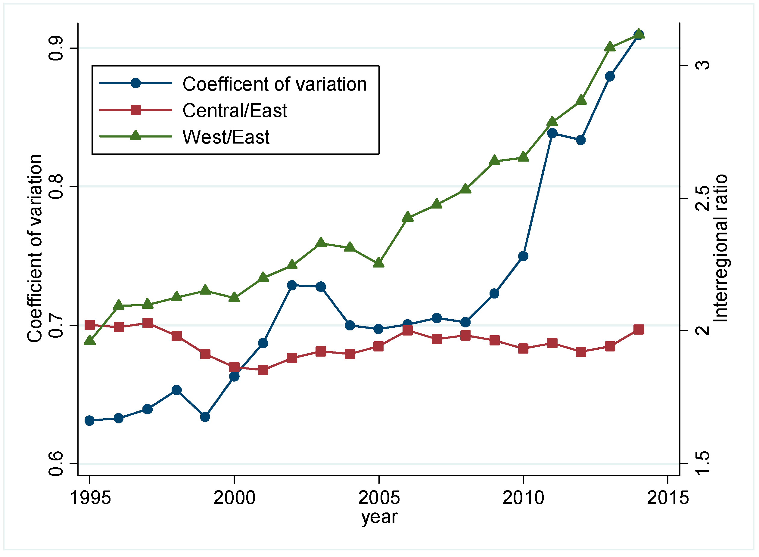 The coefficient of variation is always used as an indicator of dispersion in convergence analysis. Chinese provinces differ greatly in factor endowment, economic structure, climate, and regional development strategies. Interregional disparity in CO2 emissions is one of the important components of difference in provincial CO2 emissions. Following most studies, we classify Chinese provinces into three regions, namely the eastern, central, and western regions. Figure 1 shows the evolution trend of coefficient of variation and interregional ratios in terms of CO2 emissions intensity for the period 1995–2014. We can observe that the coefficient of variation has a broadly increasing trend in most years. However, there are two sub-periods, namely 1999–2002, and 2008–2014, when the dispersion in terms of CO2 emissions intensity increased sharply. The former is driven by the initiation of the Western Development Program, while the latter is driven by industry relocation policy in recent years. During the sample period, the ratio of central/east maintains a relatively steady state, while the ratio of west/east keeps an increasing trend. Moreover, the evolution trend of ratio of west/east is quite similar to that of the coefficient of variation. This may imply that the increase of dispersion is mainly driven by the diversion of CO2 emissions intensity in the western region from the other two regions. This further proves that regional preferential policy has a significant impact on the spatial distribution of CO2 emissions.