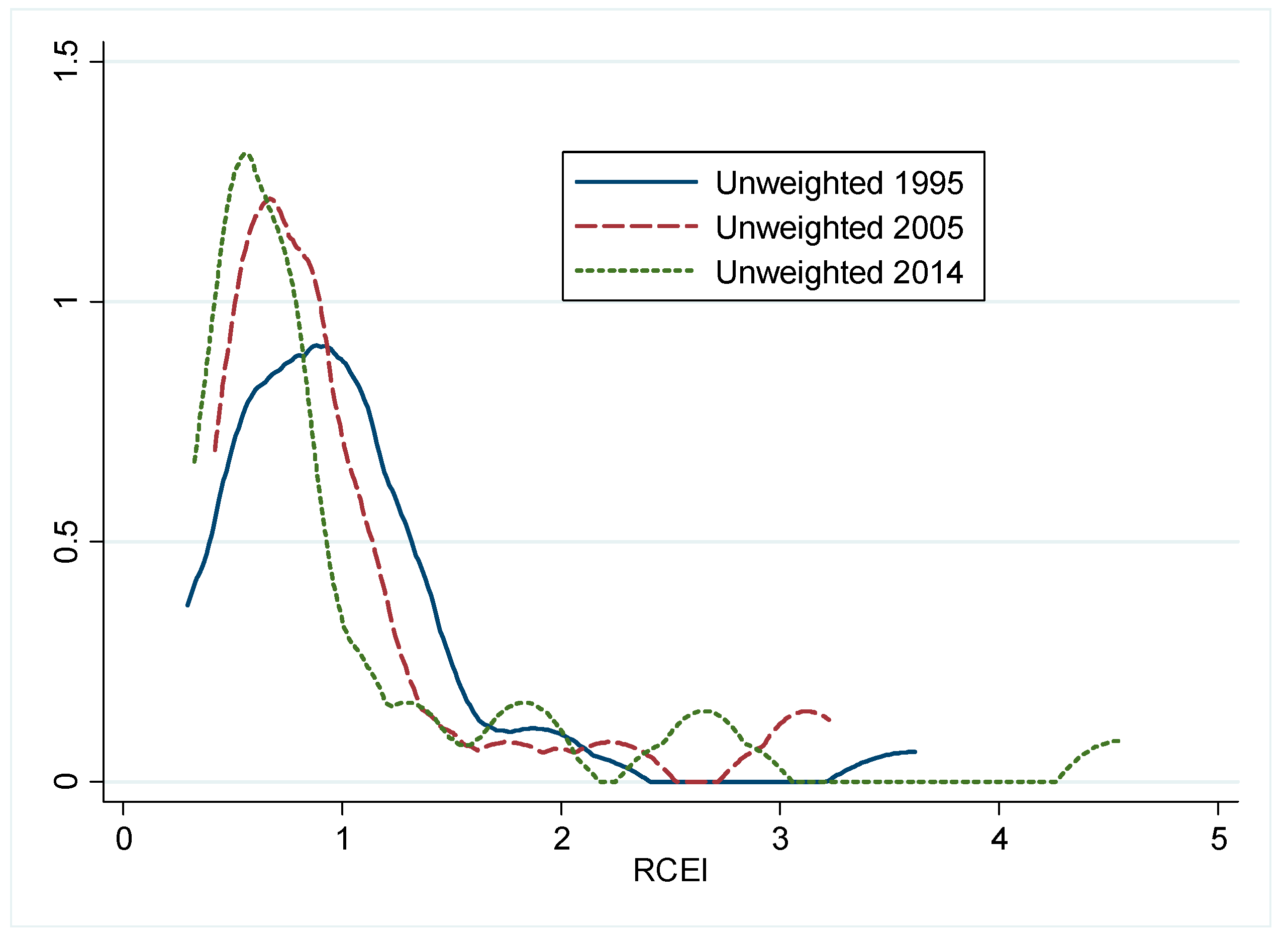 The weighted distributions of RCEI in 1995 (a); 2005 (b); and 2014 (c).