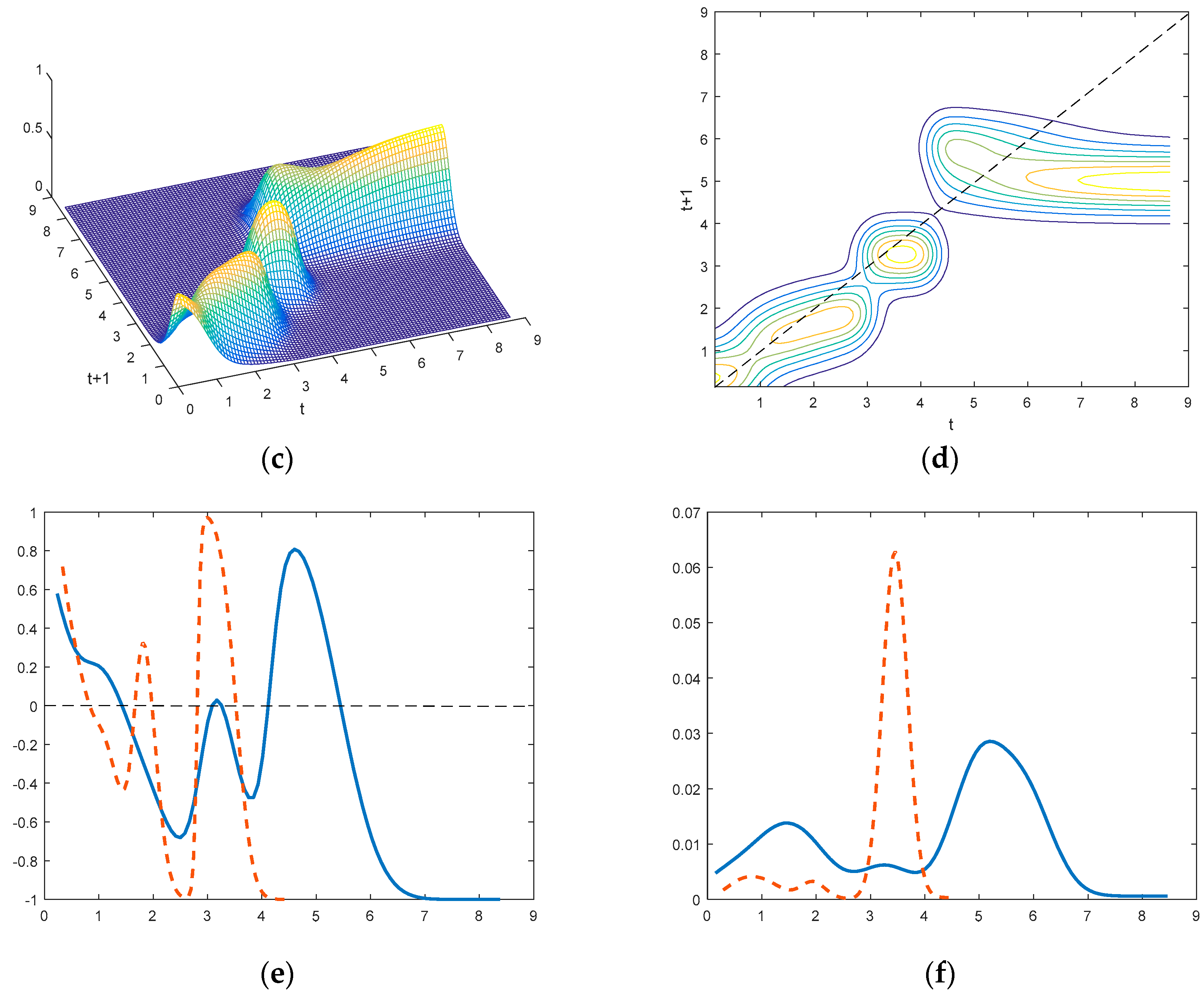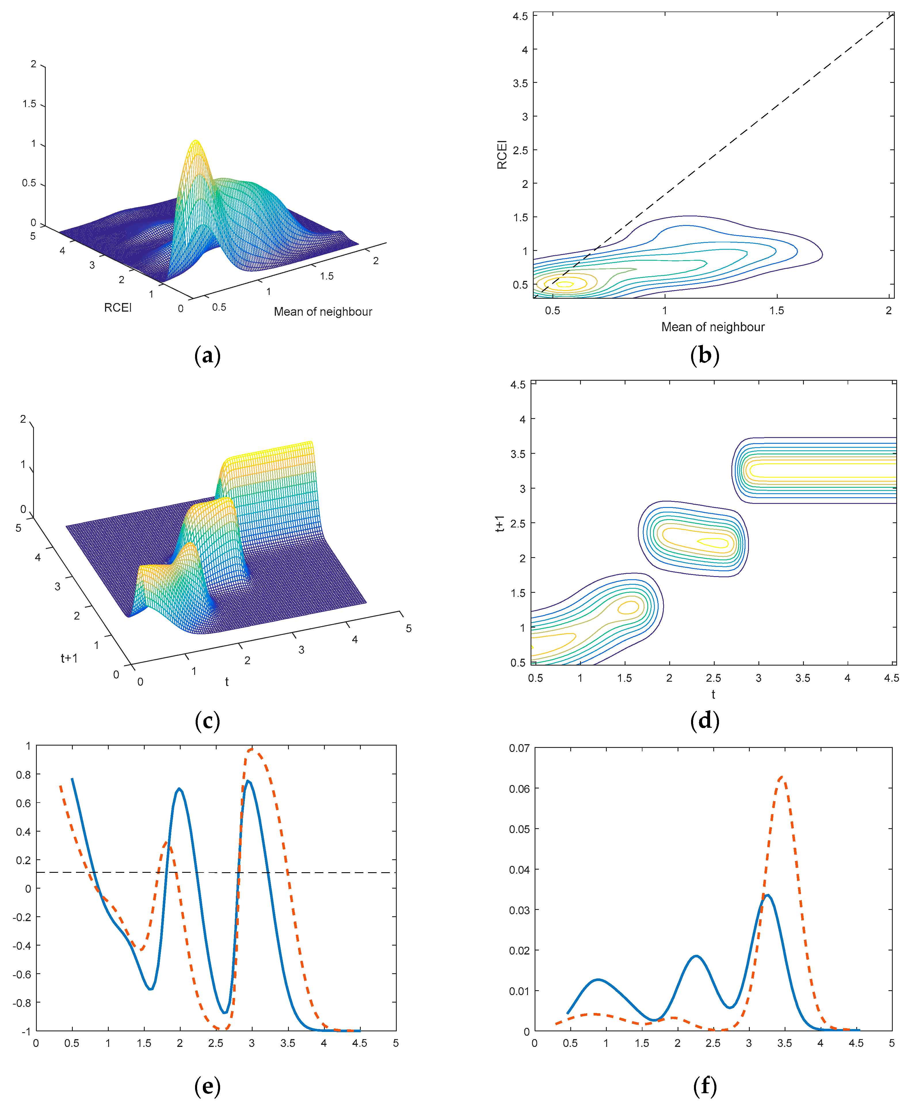 The distribution dynamics of the space conditional RPCG with annual transition, 1978–2013. Note: The solid and dashed lines show the conditional and unconditional distributions, respectively. (a) Three-dimensional plot of joint distribution; (b) Contour plot of joint distribution; (c) Three-dimensional plot; (d) Contour plot; (e) Net transition probability plot; (f) Ergodic distribution.
