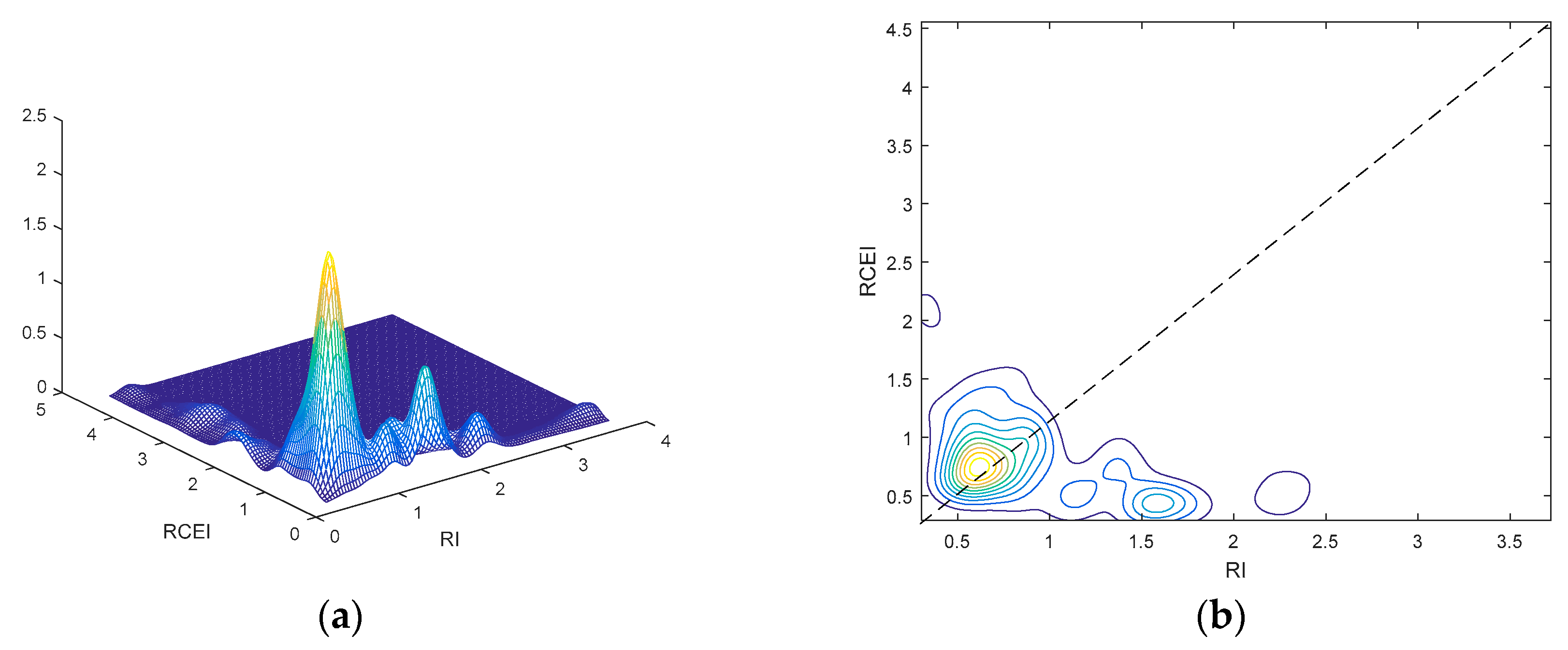 Figure 8a,b shows three-dimensional and contour plots of the joint distribution between RCEI and RI. It is observed that the probability mass distributes along two axes. Although most provinces are located in the highest peak in low income and low CO2 emissions intensity regions, there is still a considerable number of provinces concentrated in the peaks along the two axes. “Low income, high pollution” provinces co-exist with “high income, low pollution” ones in China. This phenomenon cannot be explained by the EKC theory.