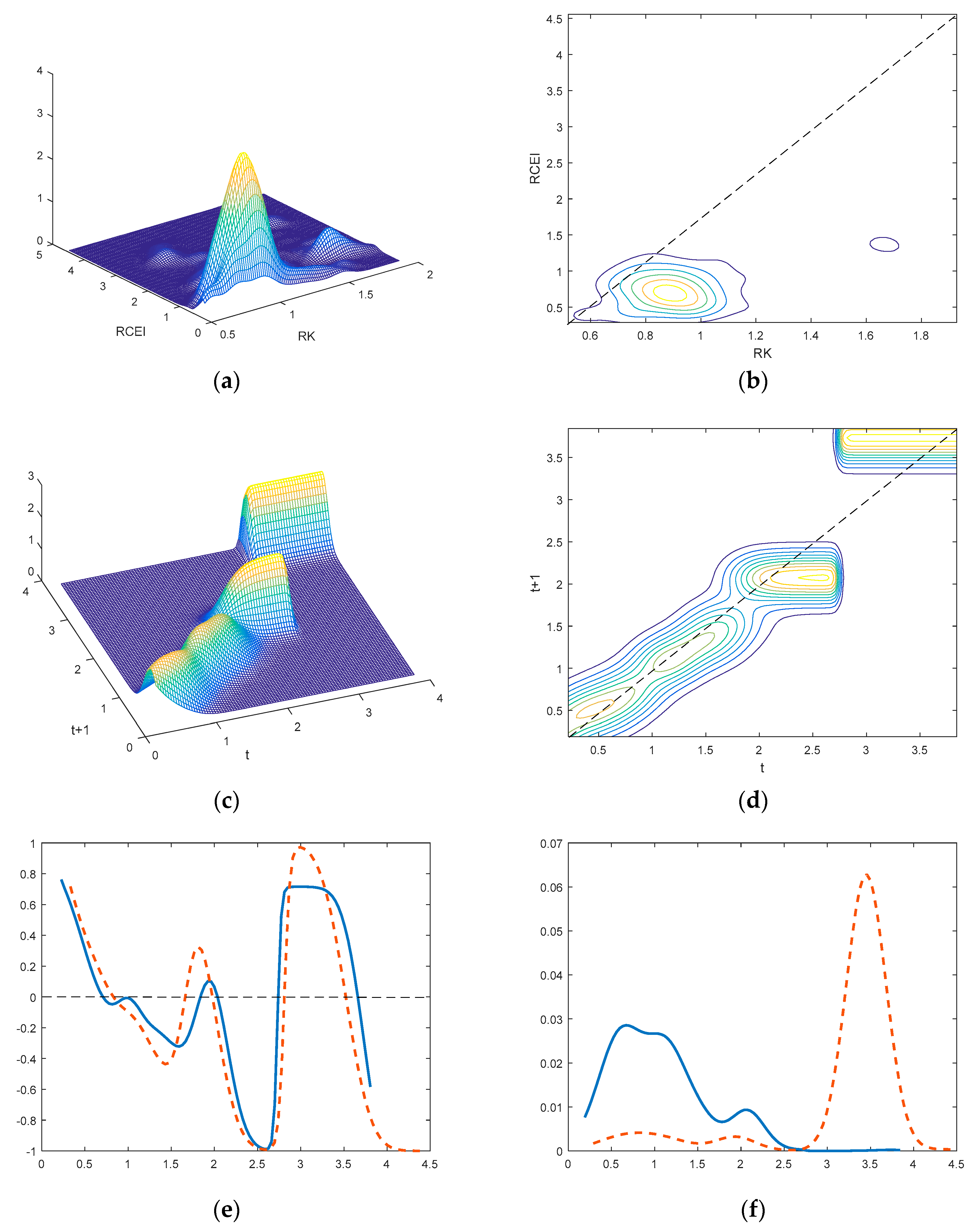 The distribution dynamics of the capital conditional RCEI with annual transition, 1995–2014. Note: The solid and dashed lines show the conditional and unconditional distributions, respectively. (a) Three-dimensional plot of joint distribution; (b) Contour plot of joint distribution; (c) Three-dimensional plot; (d) Contour plot; (e) Net transition probability plot; (f) Ergodic distribution.