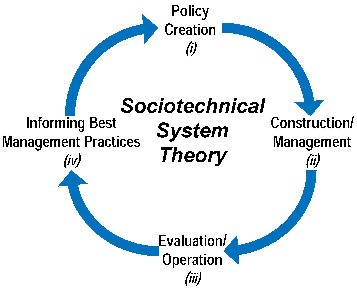 Before a discussion about sociotechnical transitions and their implications in sustainability, it is necessary to define terms. Sociotechnical systems have a long-standing history dating back to work in coal mines after World War II [58]. The phrase “sociotechnical system” was coined by Emery [59] to describe systems that have complex interactions between both human and non-human components (mainly machines). Badham et al. [60] define five key characteristics for sociotechnical systems: (i) have interdependent parts; (ii) experience stress from the external environment and have goals within that environment; (iii) have separate but interconnected social and technical subsystems; (iv) require decision-making to achieve goals; and (v) have performance based on optimizing social and technical subsystems. These five characteristics—while originally applied to industrial engineering and industrial psychology practices—have intentionally vague characteristics, allowing the applicability of the framework for many different systems, including green infrastructure.