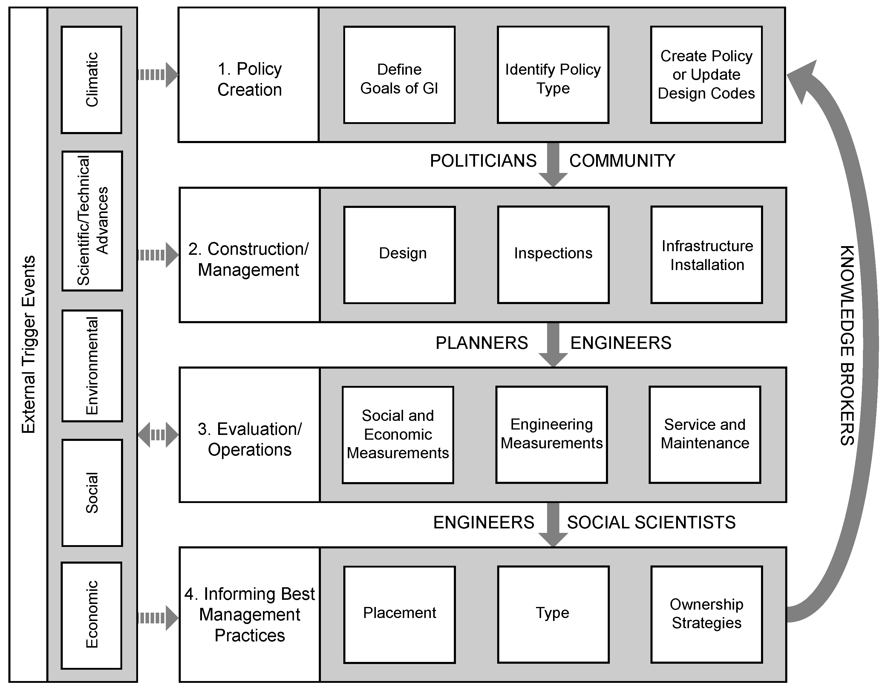 Fourth, the informing best management practices stage of the cycle includes data synthesis and decision-making based on the previously collected and evaluated data. Decisions include making informed conclusions on the placement, type, and ownership strategies of green infrastructure. Ownership strategies pertain to both lessons learned from the operational side of the green infrastructure and the effectiveness of public versus privately implemented green infrastructure systems. Knowledge brokers communicate these decisions to the policy creation stage of the cycle, where the iterative process will ideally begin again [92].