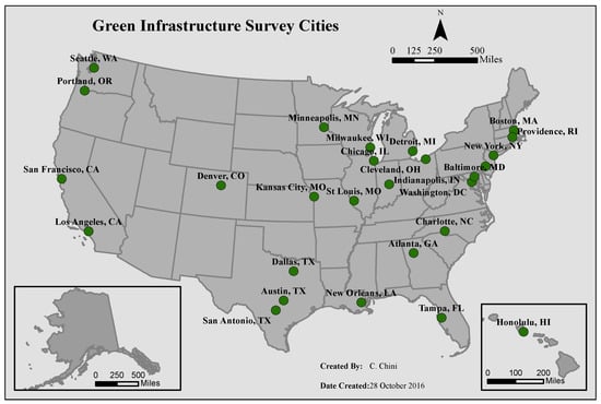 Green infrastructure is a sociotechnical system within the urban environment, requiring the integration of technical, engineering, policy, and social factors to develop and maintain a sustainable system. The variety of green infrastructure found during our study ranged from permeable pavements to wetland rehabilitation to photovoltaic solar panels; see Table 2. This wide range of best management practices requires a flexible and fluid definition of green infrastructure from a policy perspective across cities. This definition reflects the defined system boundaries of an urban laboratory and is an important first step for cities []. Green infrastructure incentives at the national or state level would need to account for the fluid interpretation of these measures. Additionally, system boundaries are evident in the motivations of green infrastructure and vary between cities (Table 1). These motivations must inform the data collection process within the urban experiment system boundaries.
